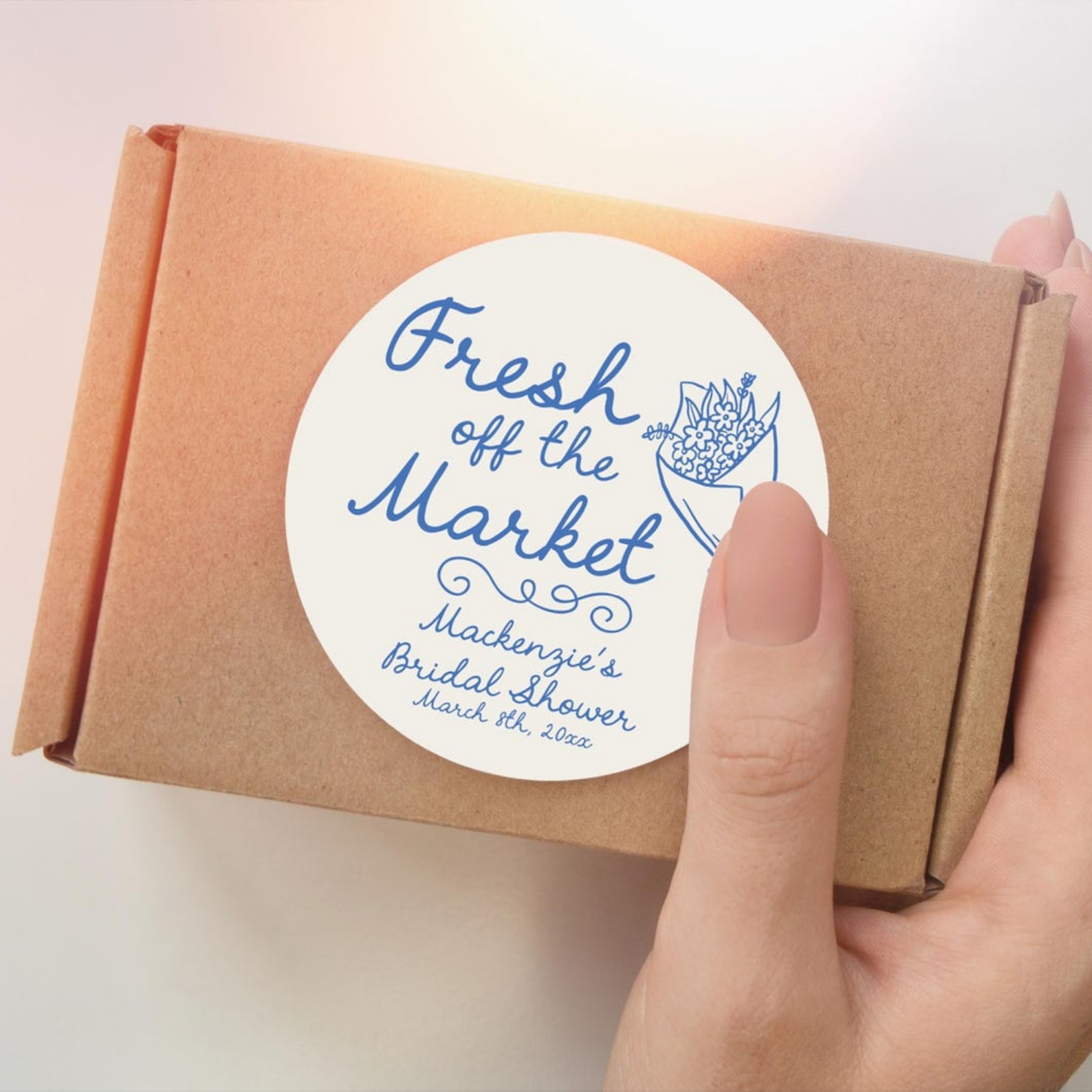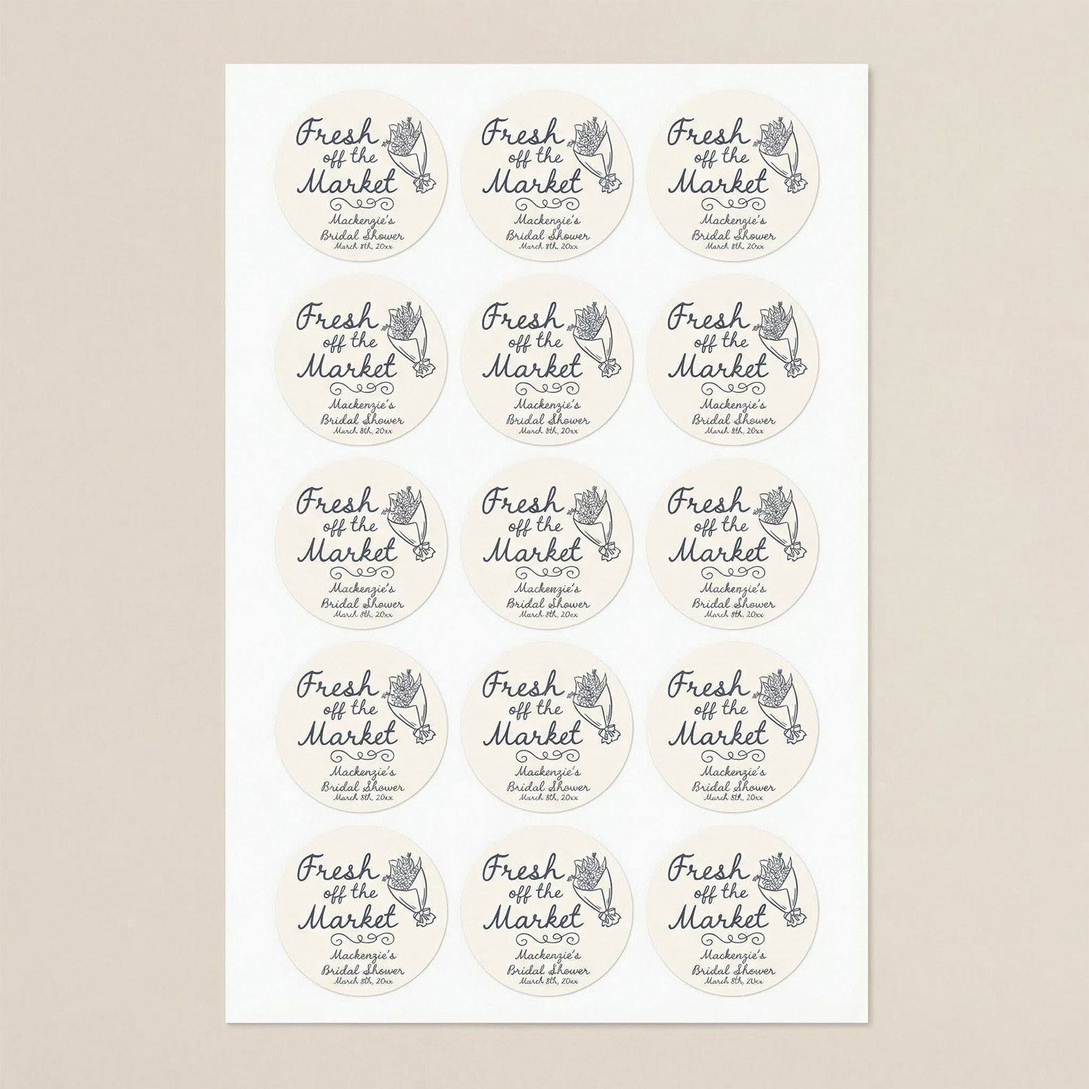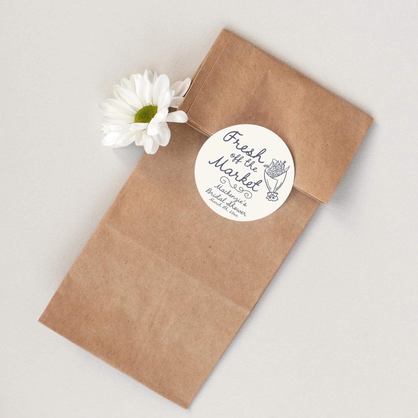"Fresh Off the Market" Stickers – These charming round labels feature your name and event details in elegant script, paired with a delicate floral illustration. Perfect for adding a personal touch to bridal shower gifts, bachelorette party favors, or wedding welcome packages.