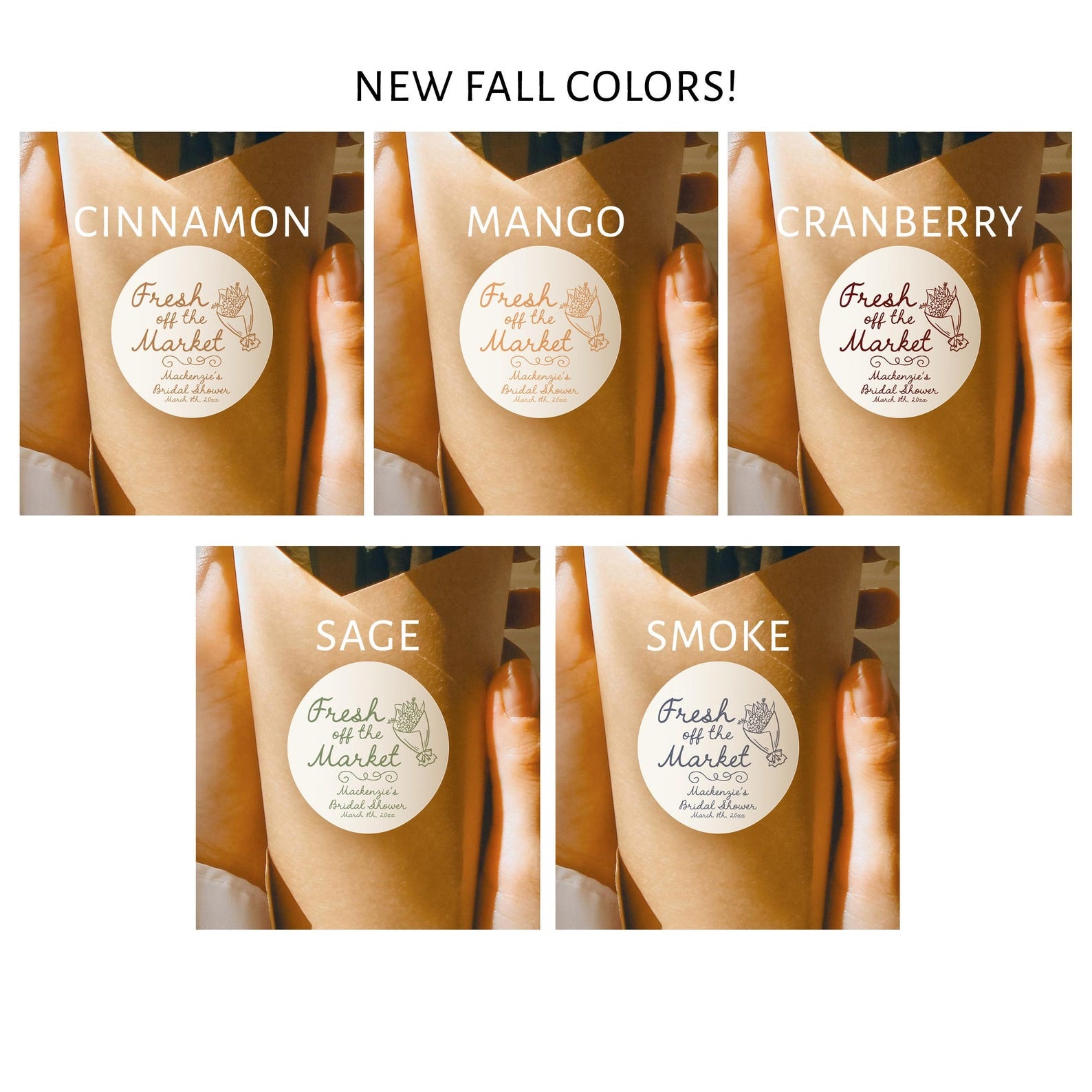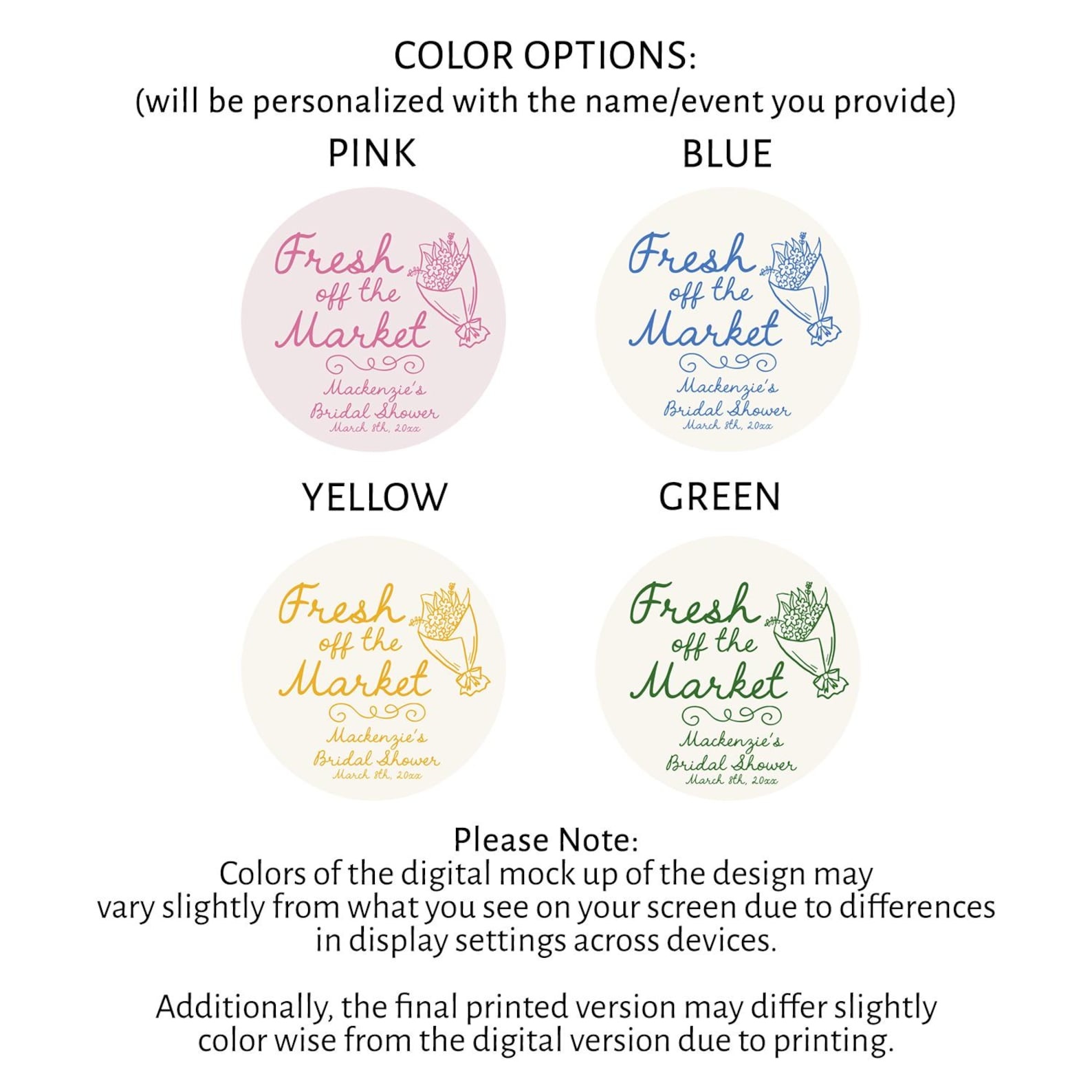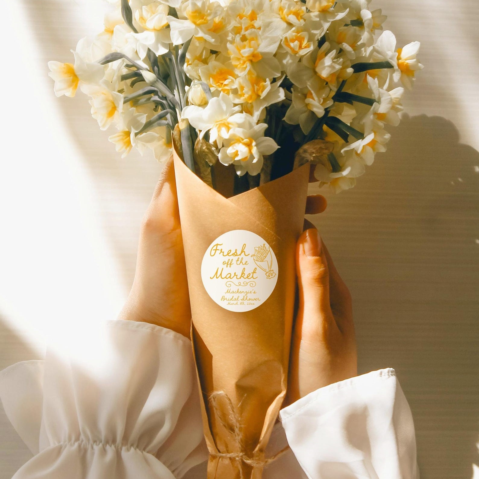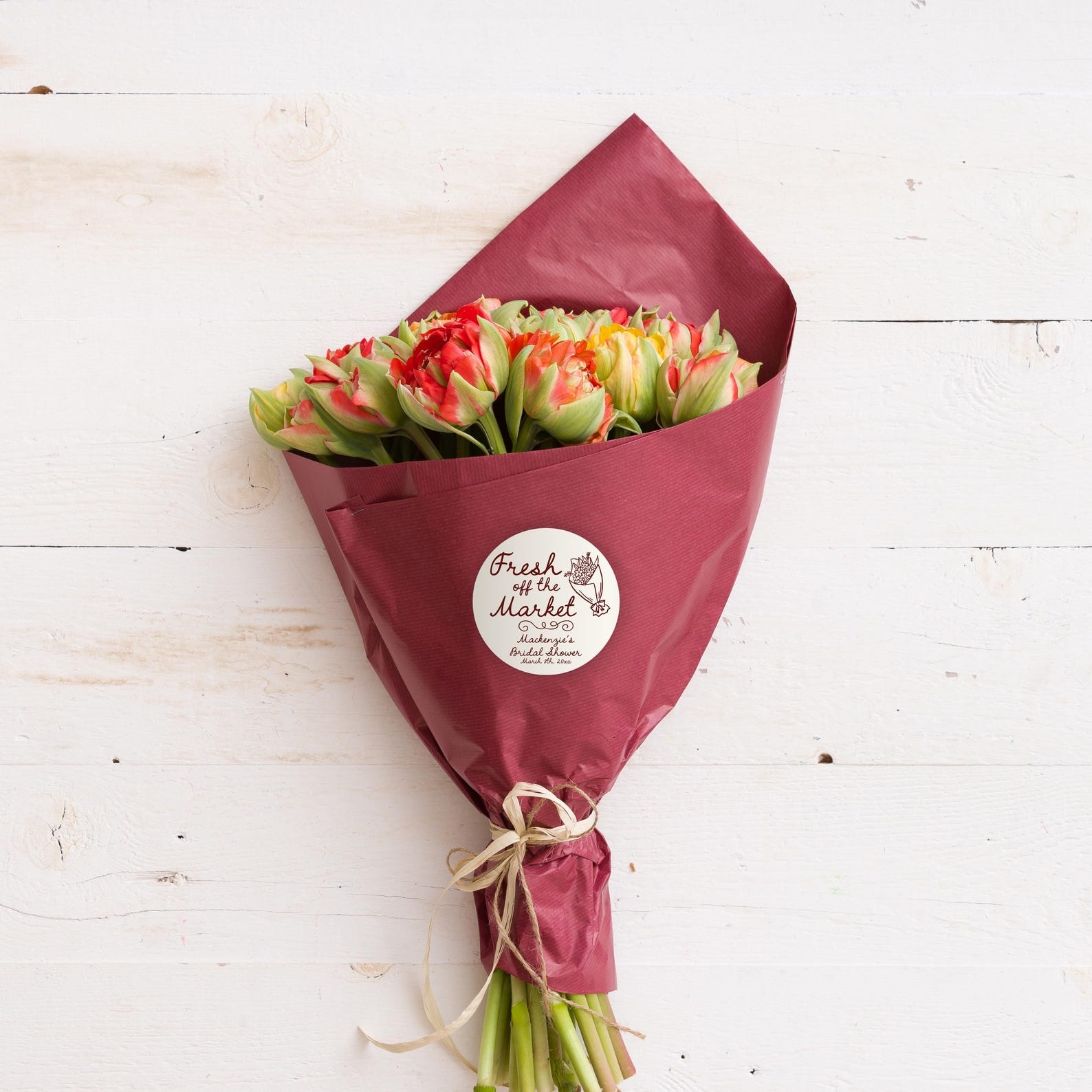 "Fresh Off the Market" Stickers – These charming round labels feature your name and event details in elegant script, paired with a delicate floral illustration. Perfect for adding a personal touch to bridal shower gifts, bachelorette party favors, or wedding welcome packages.